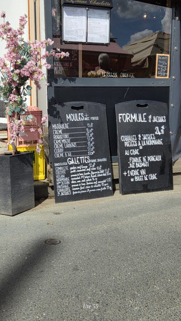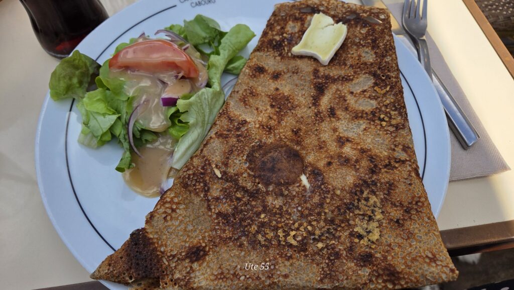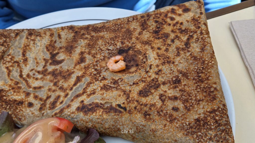 Einige Restaurants haben schon für die Nachmittagspause geschlossen, aber wir haben eins gefunden, das durchgehend auf hat. Und hier bekommen wir einen Platz direkt am Meer und wir bestellen uns Galette Normand. Das sind Buchweizenpfannkuchen oder Crepes, aber auf jeden Fall aus Buchweizenmehl. Meins gefüllt mit verschiedenem Käse, Klaus mit Fruit de Mer. Was sollen wir sagen, einfach nur lecker und dazu diese Aussicht.