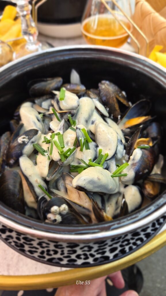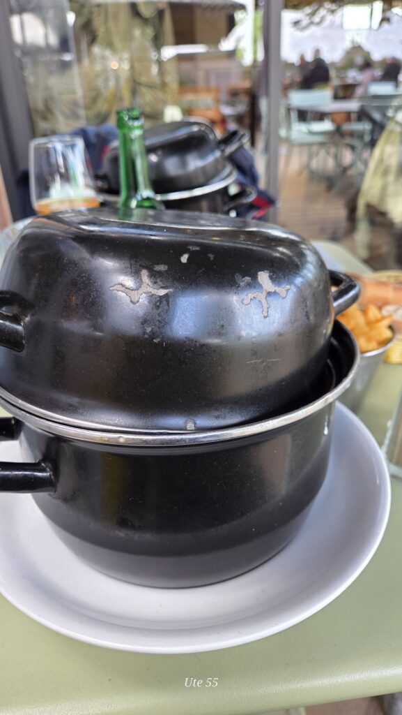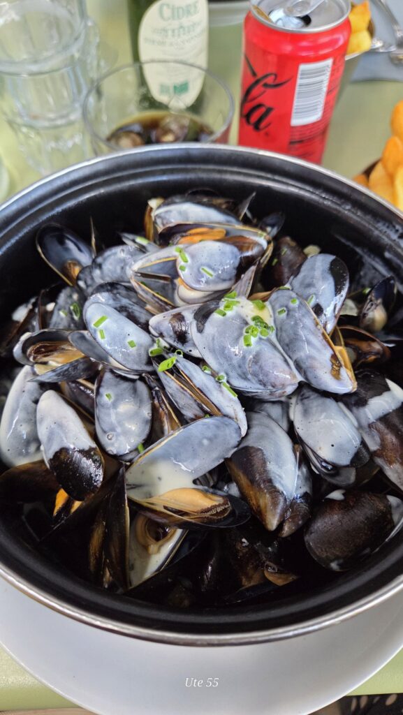 Noch eine Runde durch die engen Gassen geschlendert, um dann auf der anderen Seite des Hafenbeckens zurück zu gehen. Hier konnten wir dann dem Angebot und dem Duft der Muscheln nicht widerstehen. Tatsächlich fanden wir einen Platz für zwei, der auch mit den Hunden reichte. Und dann kamen unsere Moules Creme avec Frites. Lecker, sehr lecker.