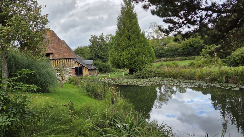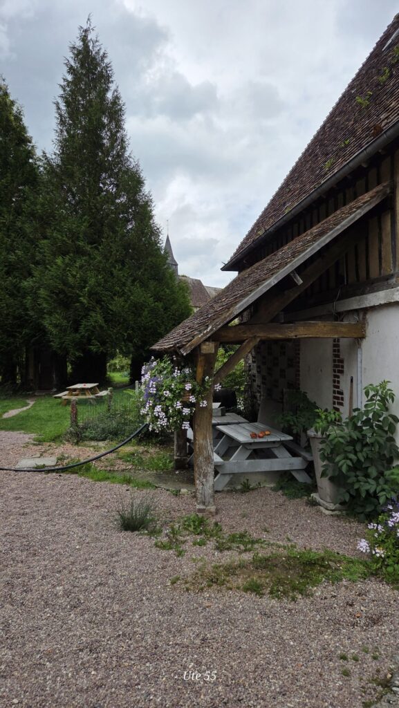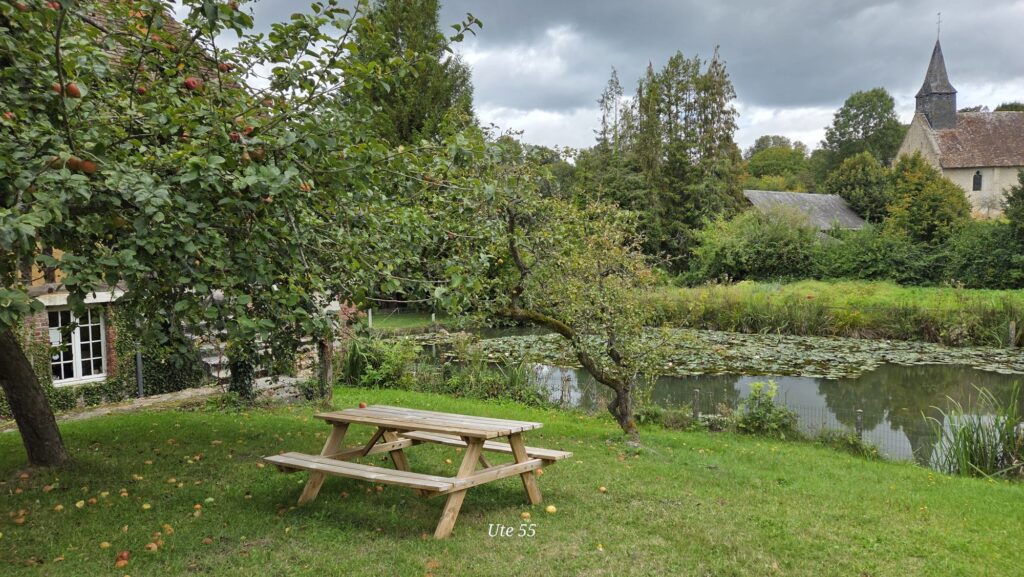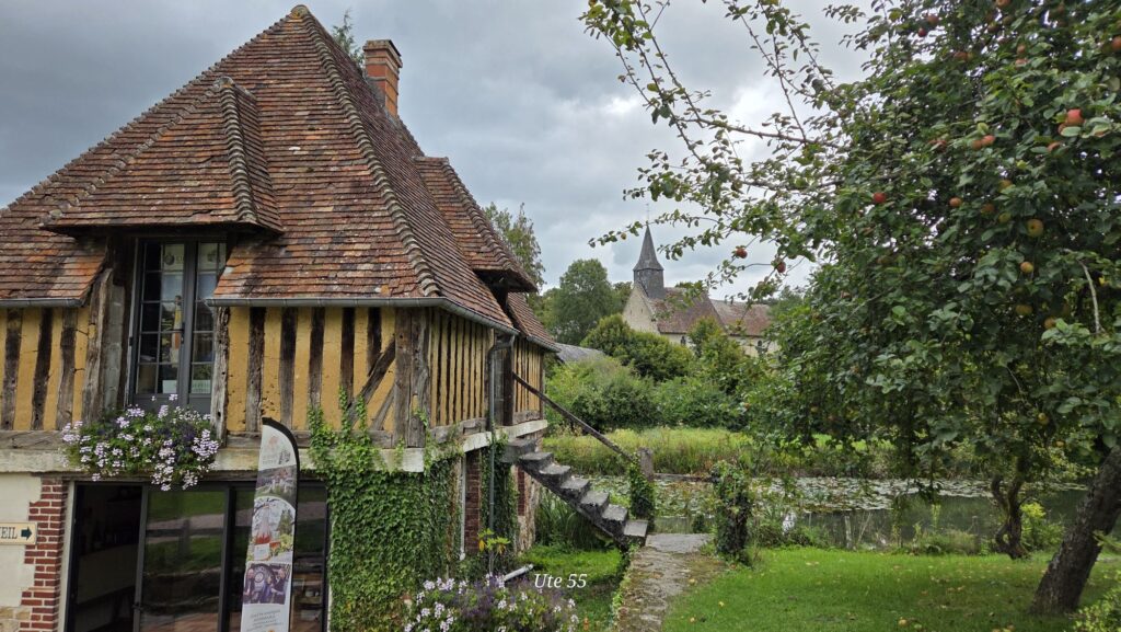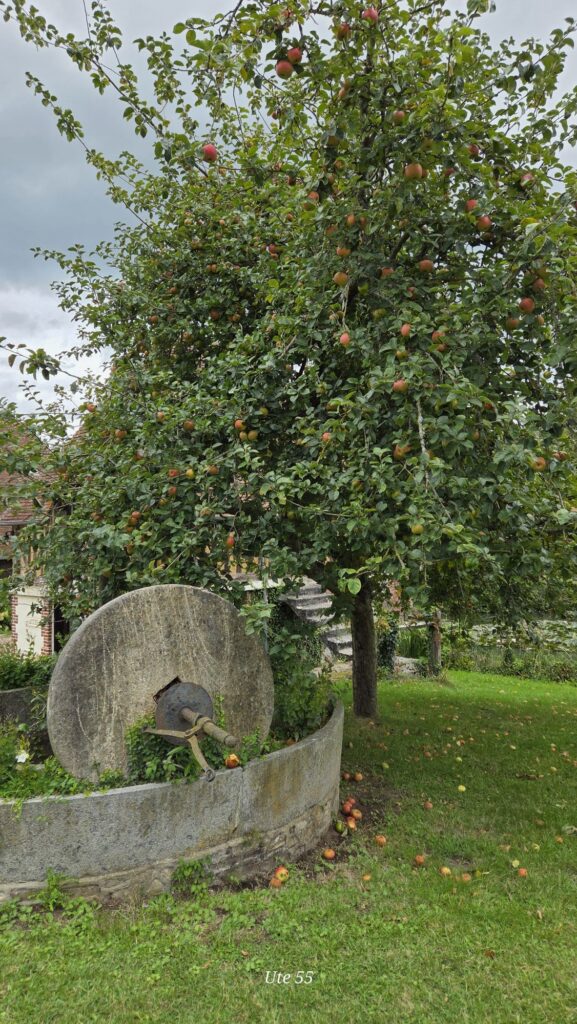 Aber da geht es hinein. Wie wunderschön ist das denn? Ein wunderschönes Haus mit einem Ensemble von Verkaufshäuschen und historischer Cidredestille, Seerosenteich und Blick auf die Kirche.Und natürlich Apfelbäume. Ein wunderbarer Abschluß unserer Rundreise auf der Route de Cidre.
