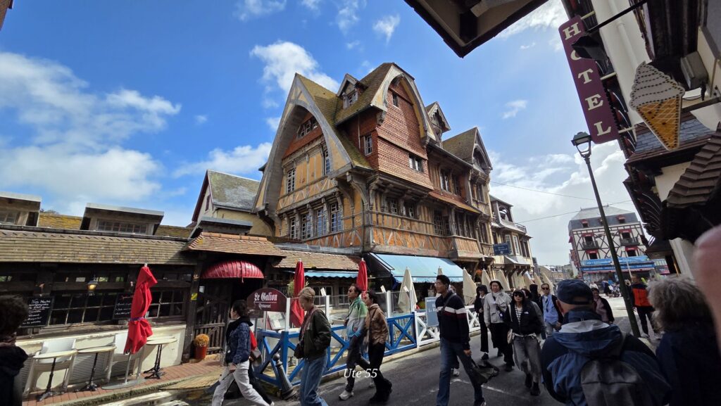 Einmal rechts um die Ecke und die liegt sie die Prachtstraße die Av. de la Mer. Eine prächtige Straße mit alten Fachwerkhäusern, vielen sehr schönen Geschäften, Restaurants, Creperien, Bars usw. Und am Ende finden wir in voller Pracht das Grand Hotel und daneben das Casino. Aber was noch viel schöner ist, davor liegt die 3,6 km lange Promenade und la Mer. Da ist es das Meer und es ist ein wunderbares Wetter, so warm, dass wir unsere Jacken ausziehen mußten.