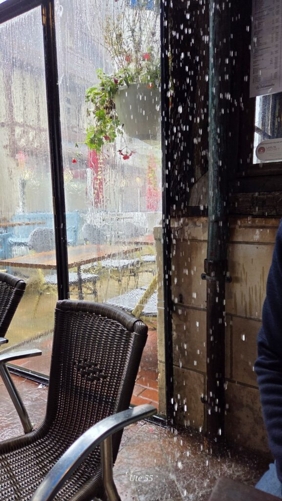 In dem einen Lokal konnte man unter einem Dach draußen sitzen. Da waren dann auch mal gleich 5 Hunde beieinander. Bedienung kam keine, das Besteck , was auf dem Tisch lag, war schmuddelig und dann fing es an zu stürmen und zu gießen. Als wenn einer ganze Schleusen geöffnet hätte. Unglaublich.