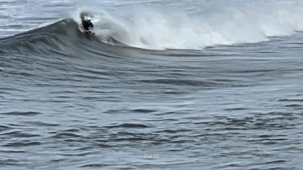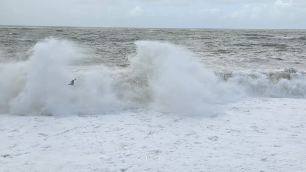 Hier tobte das Meer richtig und ich habe richtig einen auf die Hose bekommen. Während ich im Kiesbett stand und auf die richtige Welle gewartet hab, kam von der anderen Seite nicht der Seenebel, nein es kam ein gewaltiger Guss. So schnell konnten Lou und ich ja nicht flüchten, also volle Breitseite. Hose naß, Ohr naß, Jacke naß. Toll. Und immer noch nichts zu essen.