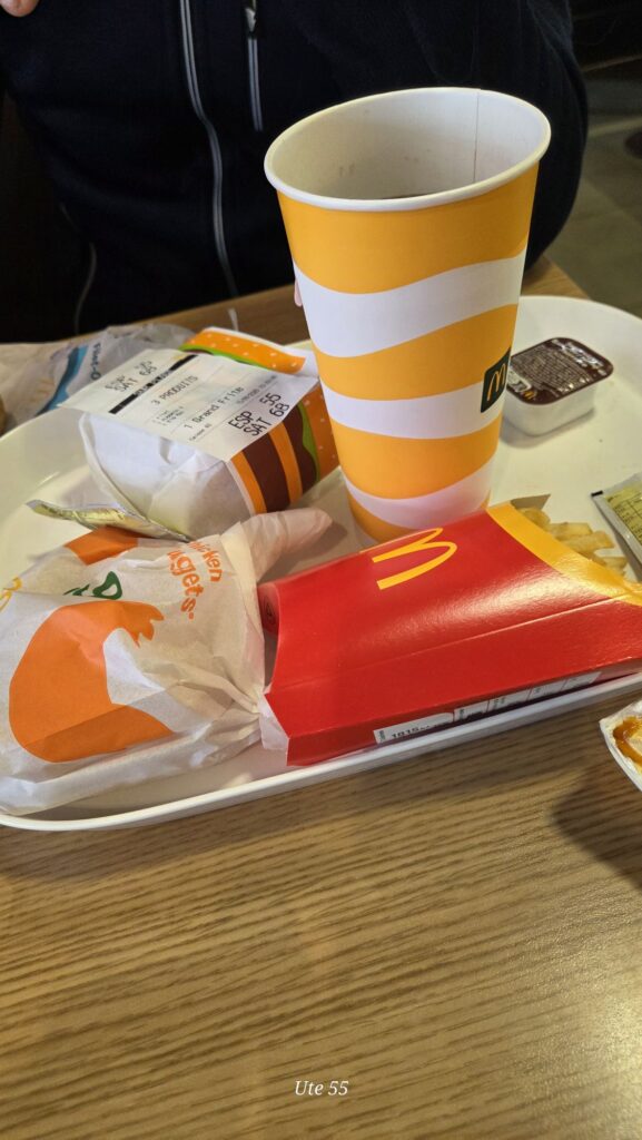 Was macht man in der Not? Zu McDonalds fahren, war nicht so leicht zu finden. Dann endlich den Magen füllen. Nichts kulinarisch, aber satt und nicht mehr durstig. WC gab es auch.
